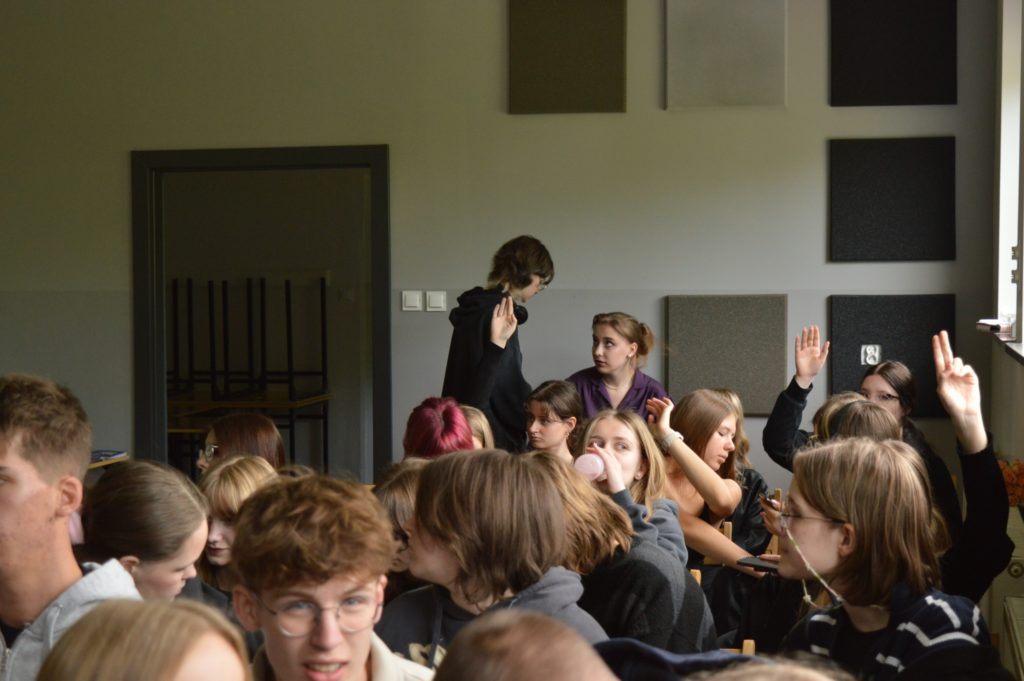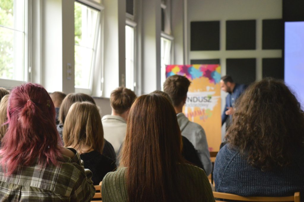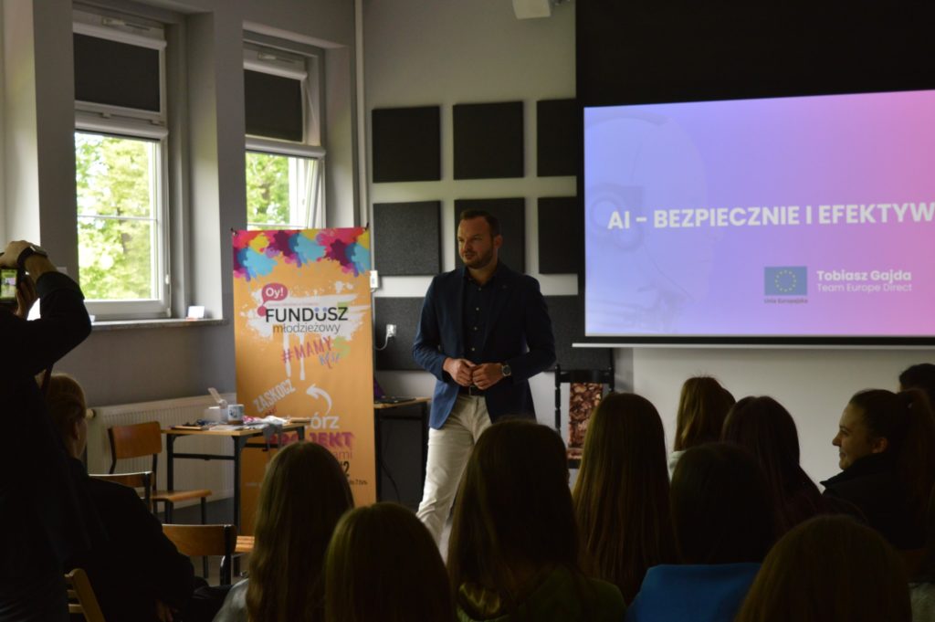 Pan Oliwier przedstawił uczniom co oferuję organizacja Europa Iuvenis, a także opowiedział jak wziąć udział w ich projektach dla młodzieży.