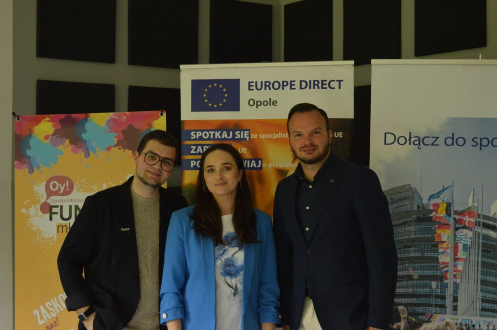 W piątek 23.05 uczniowie klas 2d, 2e i grupa psychologiczni mieli okazję uczestniczyć w spotkaniu z przedstawicielami: Europa Iuvenis Oliwierem Domańskim, punktu Europe Direct Opole Anną Duraj oraz z ekspertem Team Europe Direct Tobiasz Gajda.