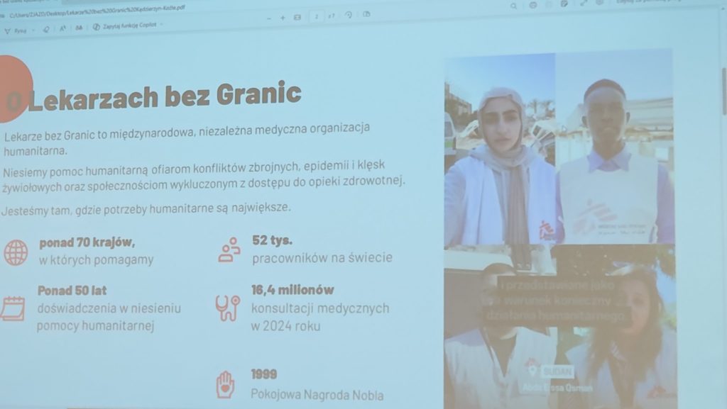Okazja jedna nas milion! 21. listopada 2025 r. klasy 3e i 1b I Liceum Ogólnokształcącego im. H. Sienkiewicza w Kędzierzynie-Koźlu miały możliwość uczestniczyć w spotkaniu z Panią Draginja Nadaždin, prezes organizacji Lekarze Bez Granic, organizacji, która pomaga ludziom, którzy mieszkają na terenach objętych konfliktami zbrojnymi. Lekarze Bez Granic pracują praktycznie na każdym kontynencie, w 2024 udzielając ponad 18 000 000 konsultacji medycznych, na Ukrainie, w Strefie Gazy, Czadzie…