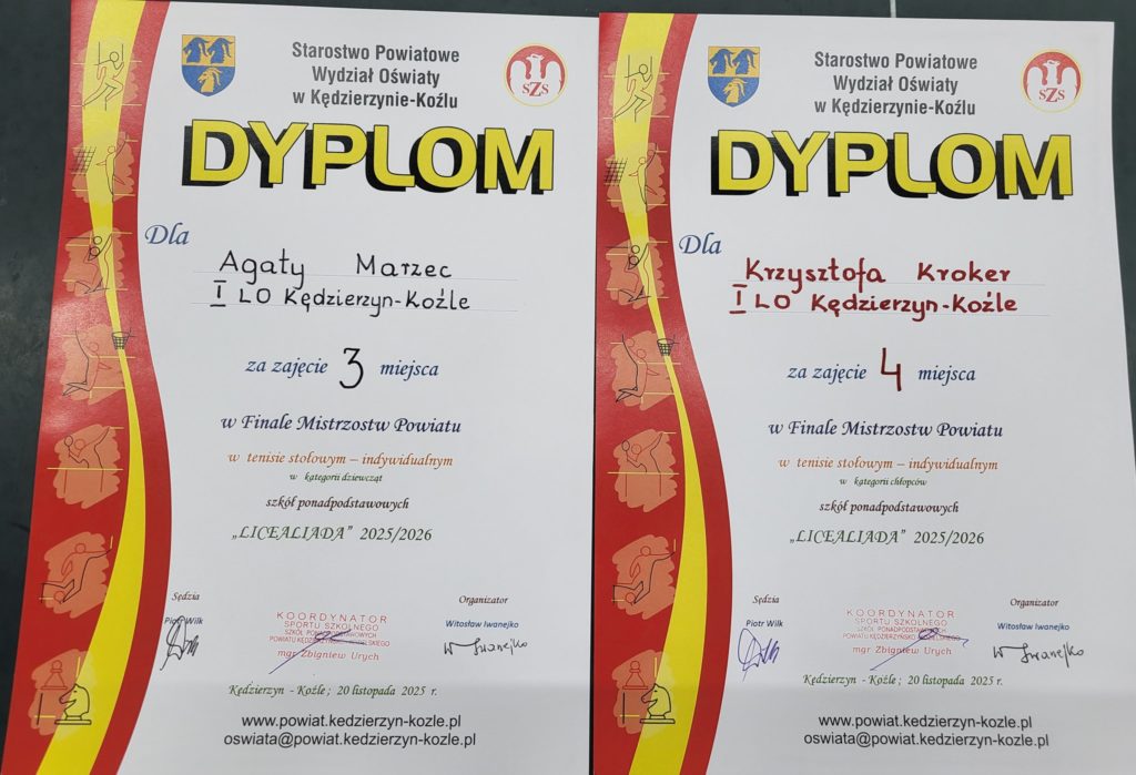 W czwartek 20.11.2025 w hali Śródmieście w Kędzierzynie-Koźlu odbyły się Mistrzostwa Miasta i Powiatu w indywidualnym tenisie stołowym w kategorii dziewcząt i chłopców. Naszą szkołę reprezentowały: Agata Marzec kl.3a; Anna Gryc kl.4b; Krzysztof Kroker kl.4a; Paweł Konieczny kl.4a; Alan Malik kl.4a i Daniel Krusiec kl.4a.