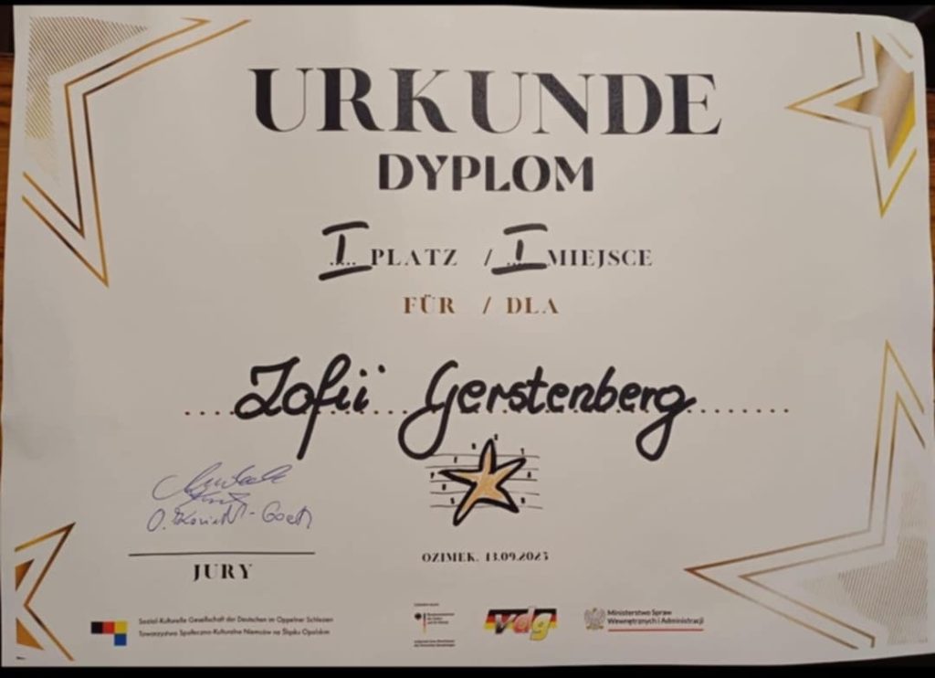 Z radością informujemy, że w finale konkursu języka niemieckiego „Superstar” w Ozimku, organizowanego przez Towarzystwo Społeczno-Kulturalne Niemców na Śląsku Opolskim uczennica I LO w Kędzierzynie-Koźlu Zofia Gerstenberg zdobyła I miejsce w swojej kategorii wiekowej.